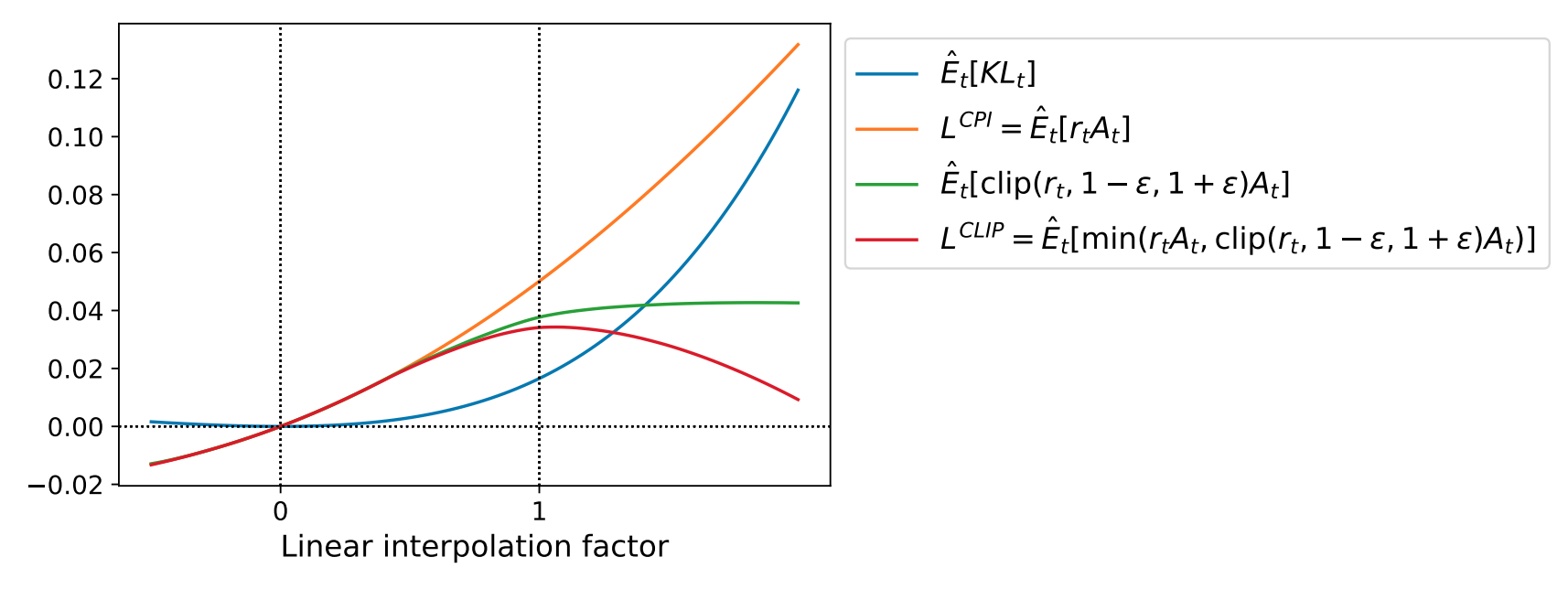 Conservative policy iteration (CPI): \(L^\text{CPI}(\theta) = \hat{E}_t \left[ r_t(\theta) \hat{A}_t \right]\).