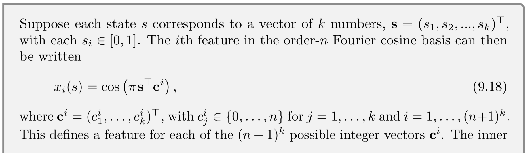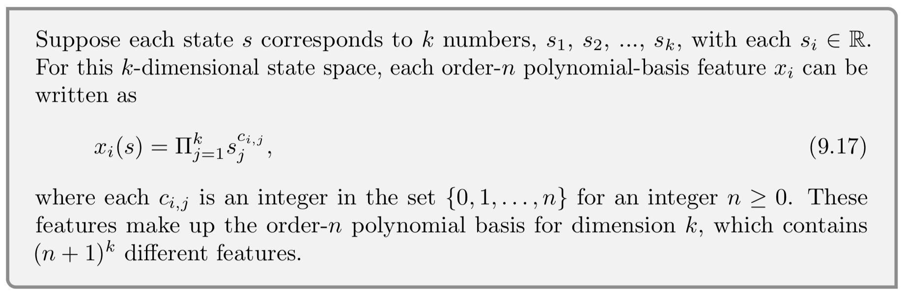 Exercise 9.1 page 209. How are the tabular methods special cases of linear function approximation. What is \(\mathbf{x}(s)\)?