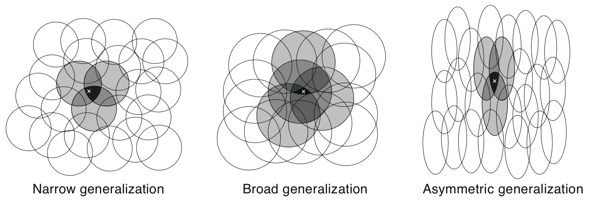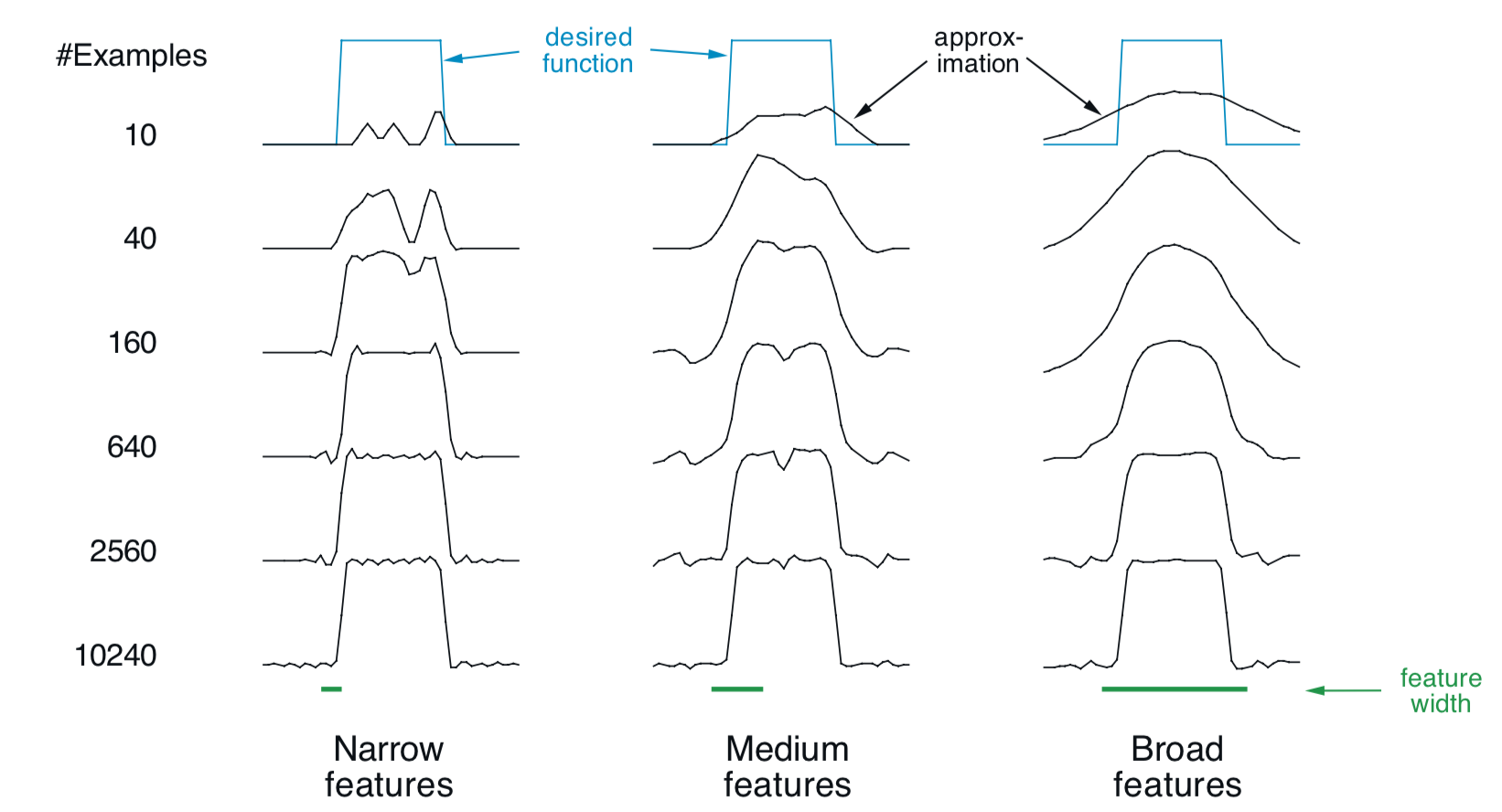 Receptive field shape strong effect on generalization(first row) but little effect on asymptotic approximation quality (last row)