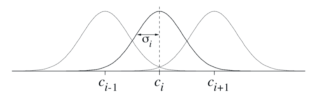 \[ x_i(s) = \exp\left(-\frac{\|s-c_i\|^2}{2\sigma_i^2}\right) \]